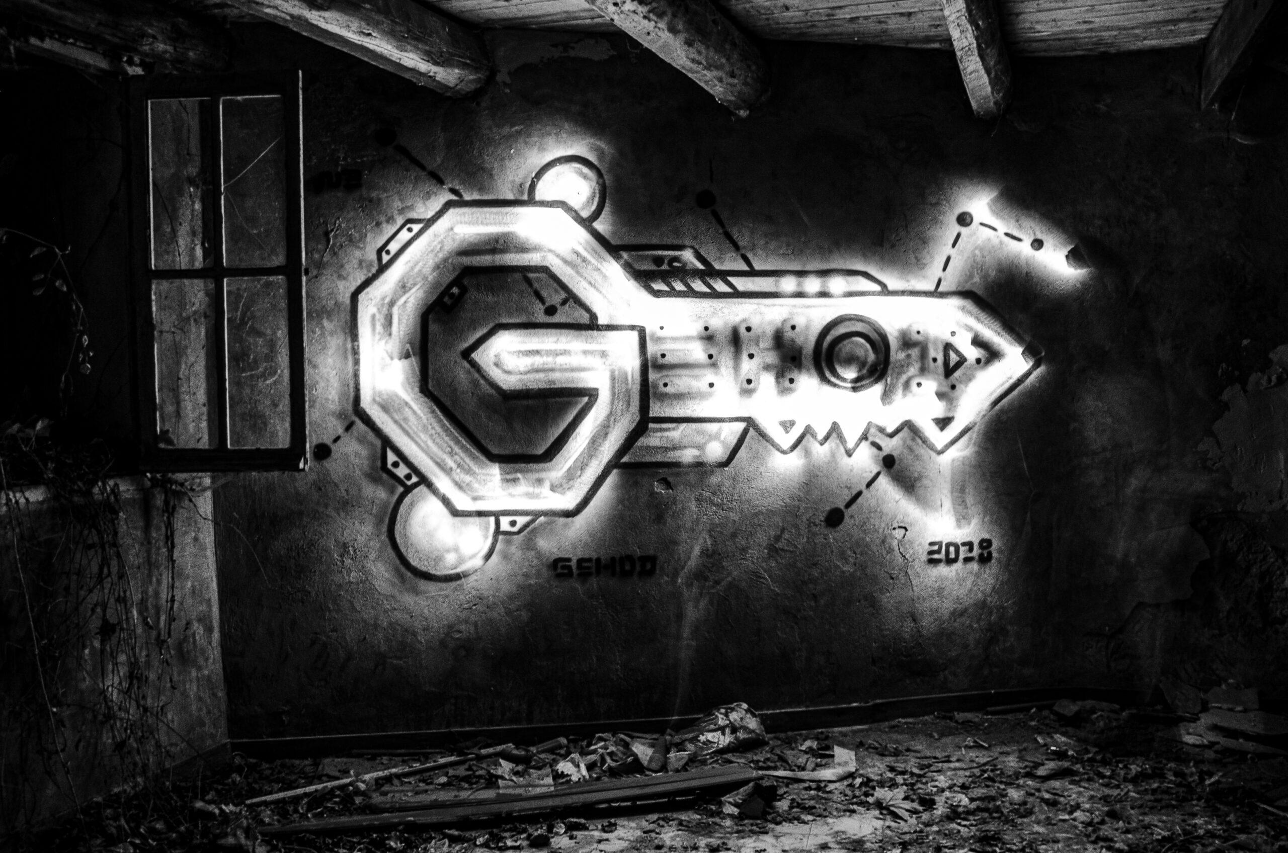 Une clé géante, sculptée par la lumière et le tag, s’empare de ce mur d’usine abandonné. Sur le papier Fine Art, les contrastes sont extrêmes : le noir profond absorbe la lumière ambiante, tandis que le tracé blanc de la clé jaillit avec une intensité lumineuse. Cette œuvre est un véritable totem urbain, une invitation à ouvrir les portes de l’imaginaire dans un lieu oublié. Le grain du papier d’art, magnifié par sa matité absolue, apporte une texture organique et une noblesse rare à ce graffiti. L’absence de reflets permet une immersion totale dans cette apparition monumentale.