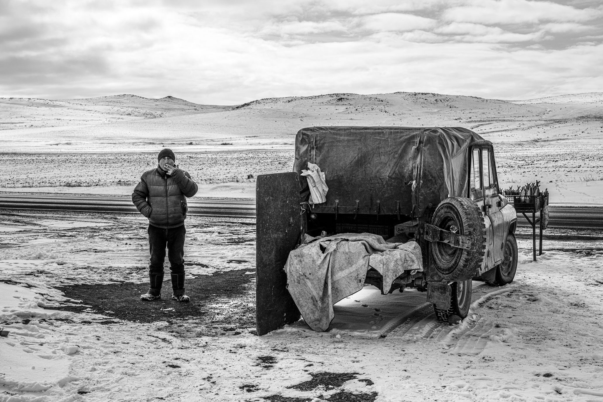 L’œuvre : Un portrait saisissant de l’Arménie rurale en plein hiver. Cette photographie immortalise un moment de solitude et de résilience sur les rives d’un lac gelé. Entre le véhicule tout-terrain marqué par le temps et la silhouette pensive du pêcheur, l’œuvre capture l’essence même du rapport entre l’homme et une nature indomptable. Un noir et blanc texturé qui souligne la rudesse et la beauté des hautes terres.