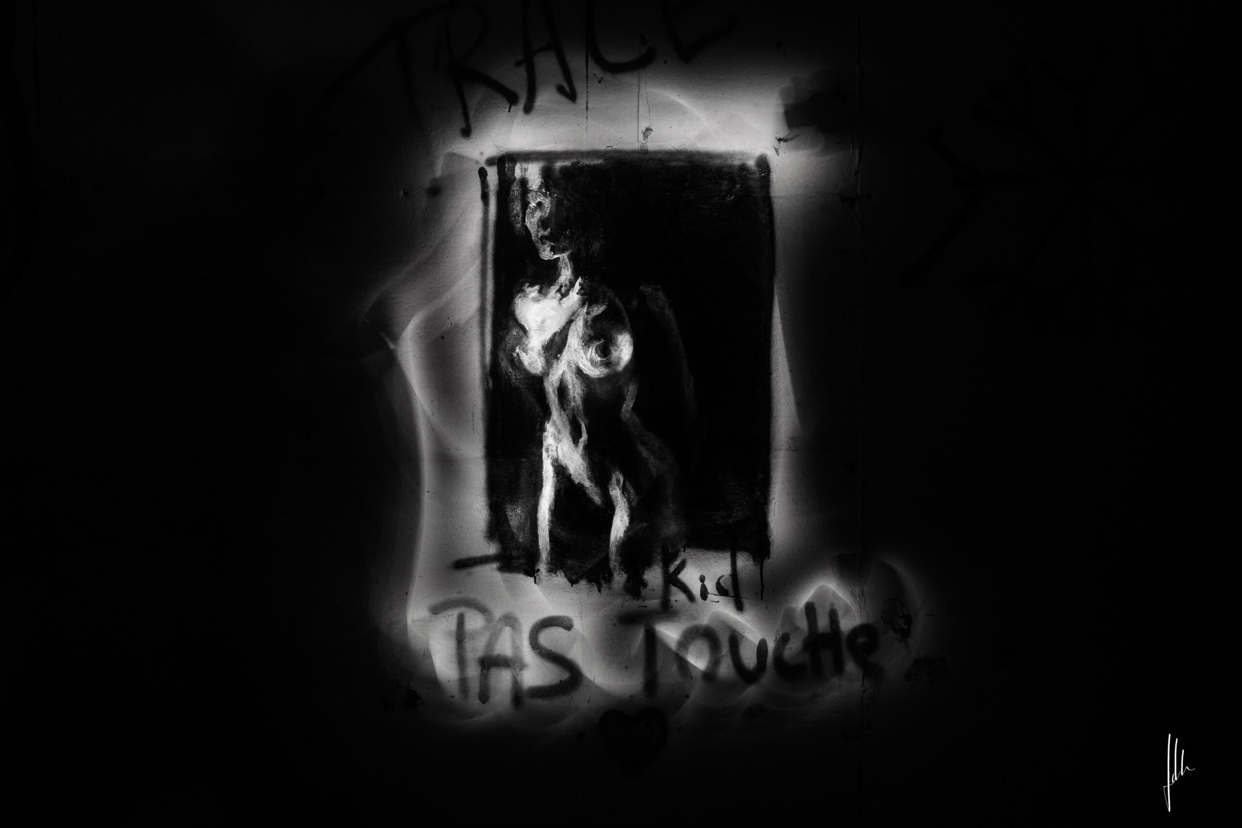 • Contraste Émotionnel : Le modelé délicat du corps féminin, traité en ombres et lumières, contraste violemment avec les inscriptions graffitées au pochoir et à la main. Le message “PAS TOUCHE” devient à la fois un avertissement de rue et une déclaration de souveraineté sur son propre corps.