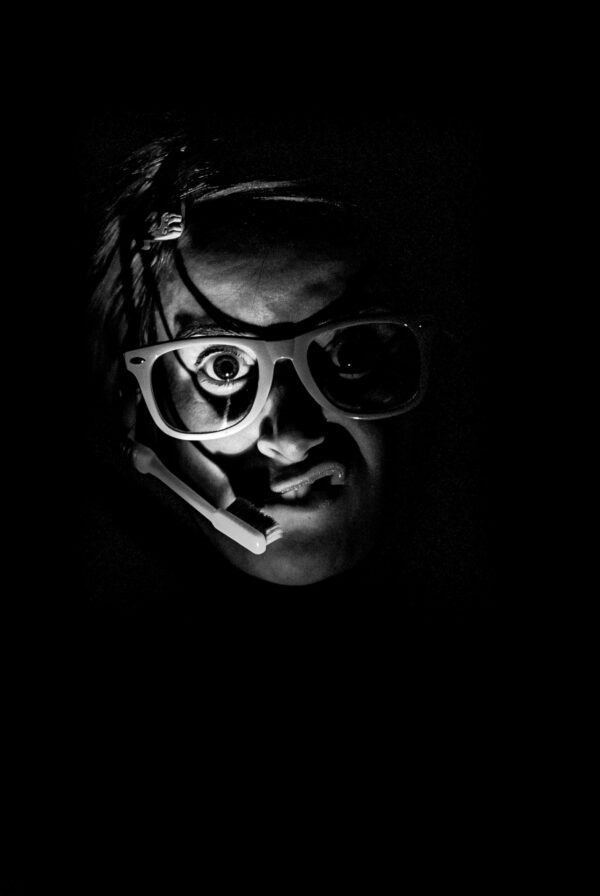 La Diva du groupe en plein craquage. Pour Scotch Brit, faire une tronche dans le noir est devenu un moment de grâce absurde. L’éclairage ciselé souligne le grain de la peau et le détail du visage, créant un contraste saisissant avec le vide tout autour. C’est un portrait qui prouve que même dans le noir complet et avec une grimace impossible, elle garde une présence magnétique.