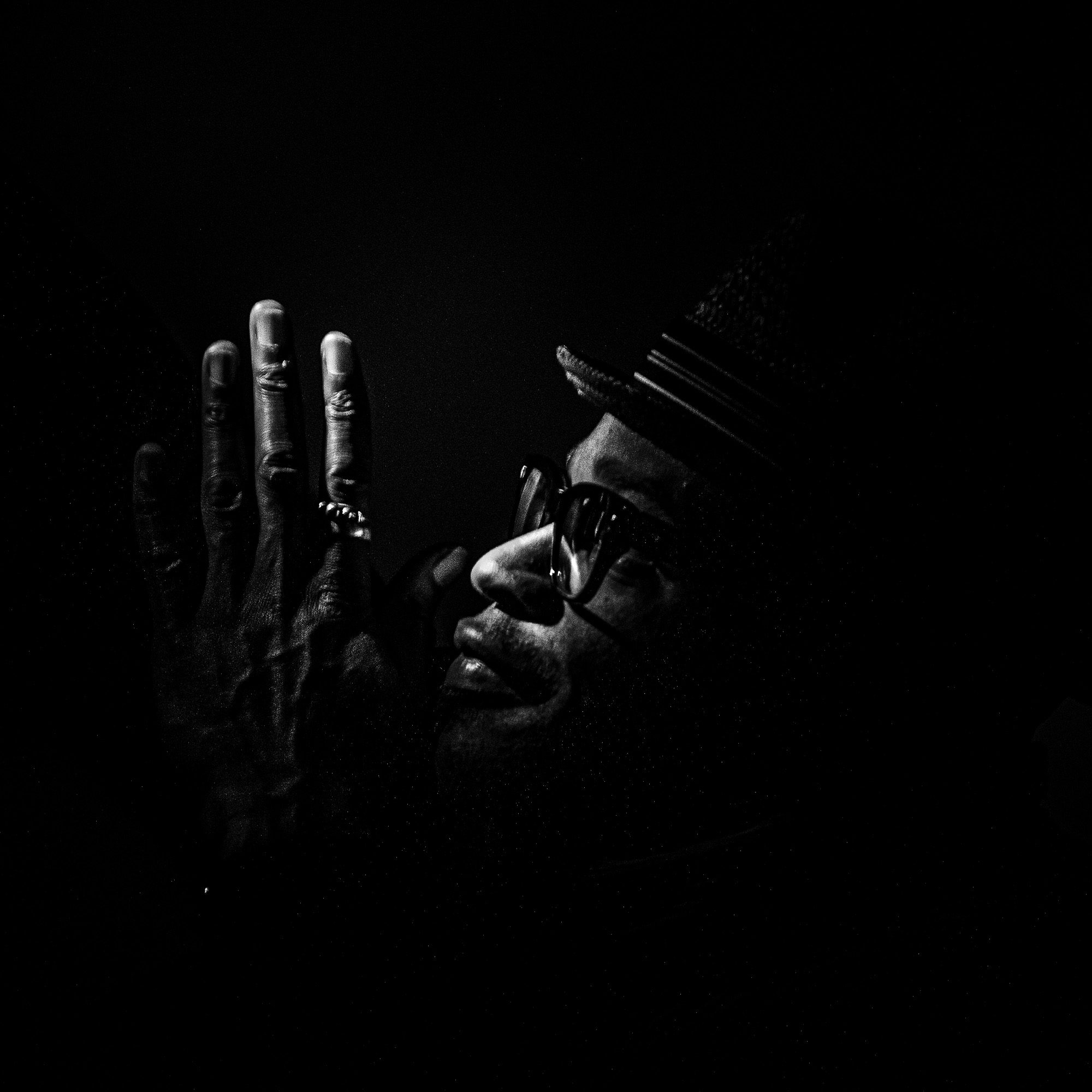 Le récit de l’image : Parfois, le silence le plus profond est celui qui reste dans l’ombre. Dans Tété, dans les portraits dans le noir, le photographe JDH nous entraîne au cœur de la création, là où la musique n’est pas un son, mais un état d’être. L’œuvre est construite sur un contraste saisissant : la silhouette de Tété émergant d’un noir abyssal, comme une révélation. Son chapeau et ses lunettes sont les seuls guides visibles, un secret partagé entre l’artiste et le photographe, mais c’est la main levée, cette main ornée d’un anneau mystérieux, qui capture toute l’attention.